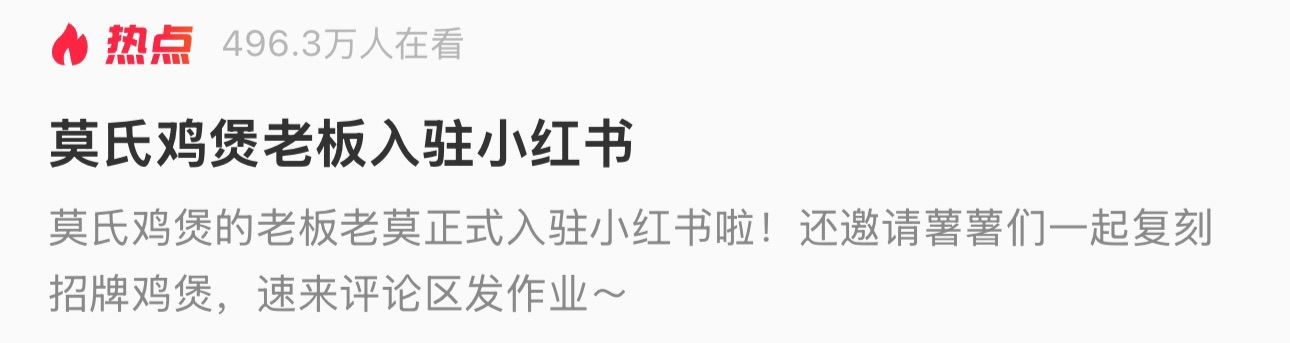 因“抗拒走红”而意外爆火的广东佛山顺德区“莫氏鸡煲”店主老莫,近日又有了新动作。4月22日,极目新闻记者注意到,老莫已正式开通小红书社交账号,并迅速引发关注。平台数据显示,“莫氏鸡煲老板入驻小红书”话题有近500万网友在看。截至22日下午4时50分,该账号粉丝数已达2.4万。个人简介简洁而亲切:“老莫在这里等你。”